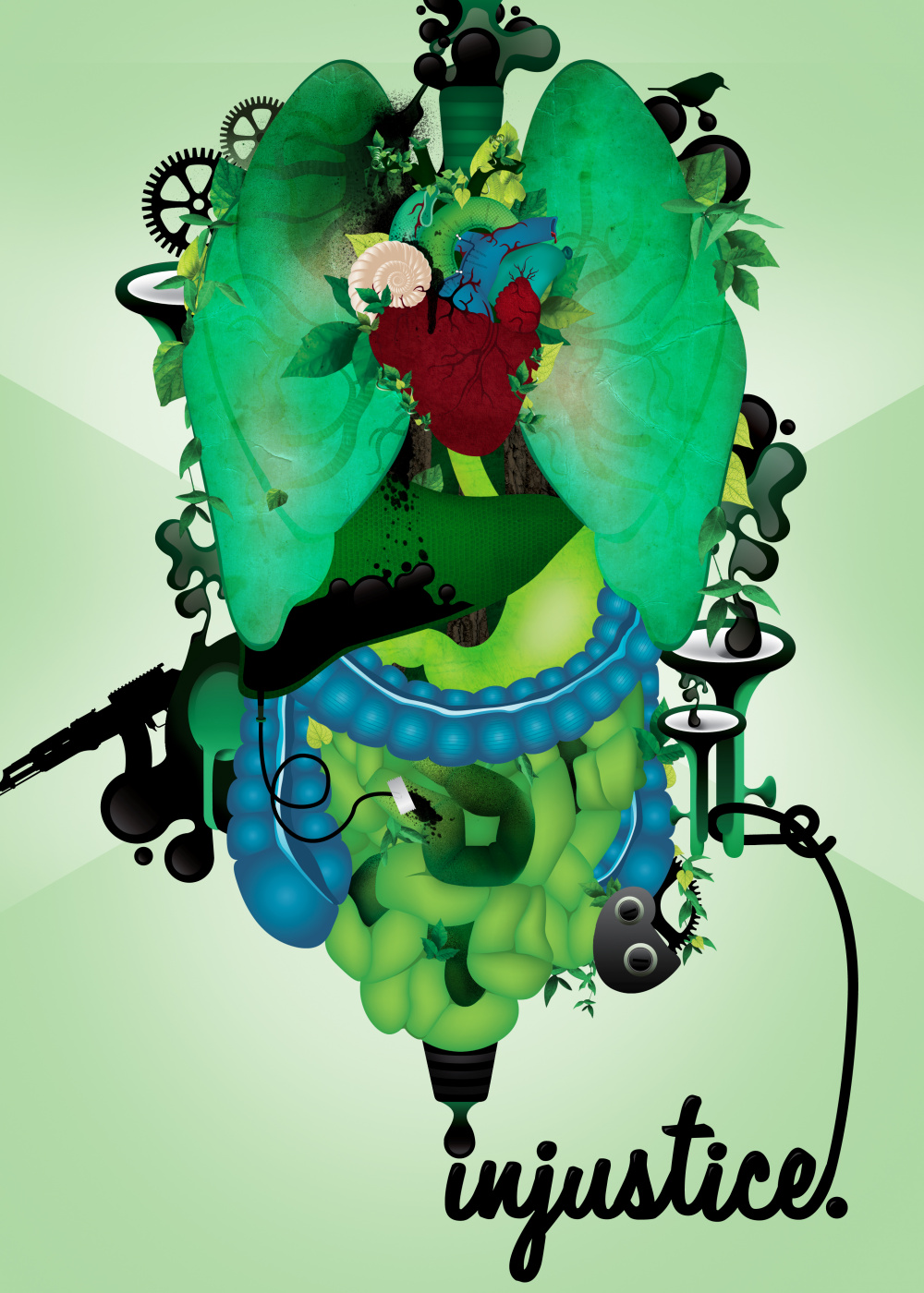 The focus of the poster is on the injustice brought about by the death penalty, in all its different forms. Through the poster, I have aimed to depict a healthy, nurtured, growing body system, brought to turmoil by lethal injection. This is depicted through the blackening of various organs and organisms. In doing so, it draws a parallel to the injustice of killing often innocent, healthy lives. In