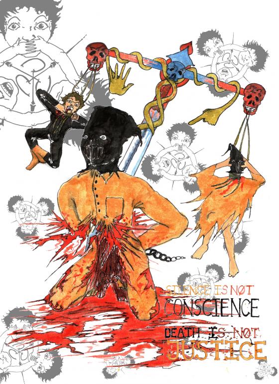 Well, my work was made in chinese ink, and laterly I edited it adding the back image made by me too.. The message is clear, the justice, when supports capital punishment, pass from be a door to freedom to be a window for separation, demonization and intolerance. Be killed for a penal court is not example for the people that is planing on their minds comit a crime; it doesn't mark the differenc