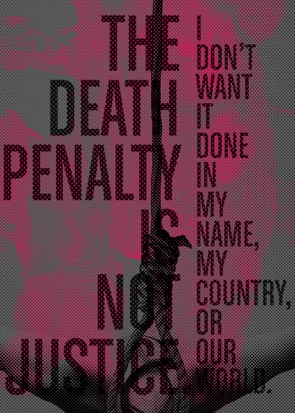 in this poster i want showcase the sentence "the death penality is not justice, i don't want it done in my name, my country, or our world" is very strong sentence and is clearly means the dissent towards the death penality. in the background i use a bitmap image that rappresent a hanged man; fluorescent spots of blood draw attention to the image crudeness