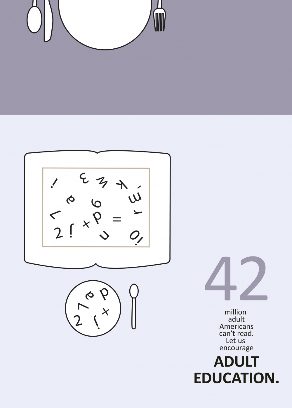 the poster is about dicremination against adult going to school.most people believe education is food for the young only,and discourages adults from educating themselves.they support the young to go to school and leave themselves behind. the images in the poster is indicating an adult having a meal with a child with the whole meal pushed infront of the child to eat. the meal is representing educat