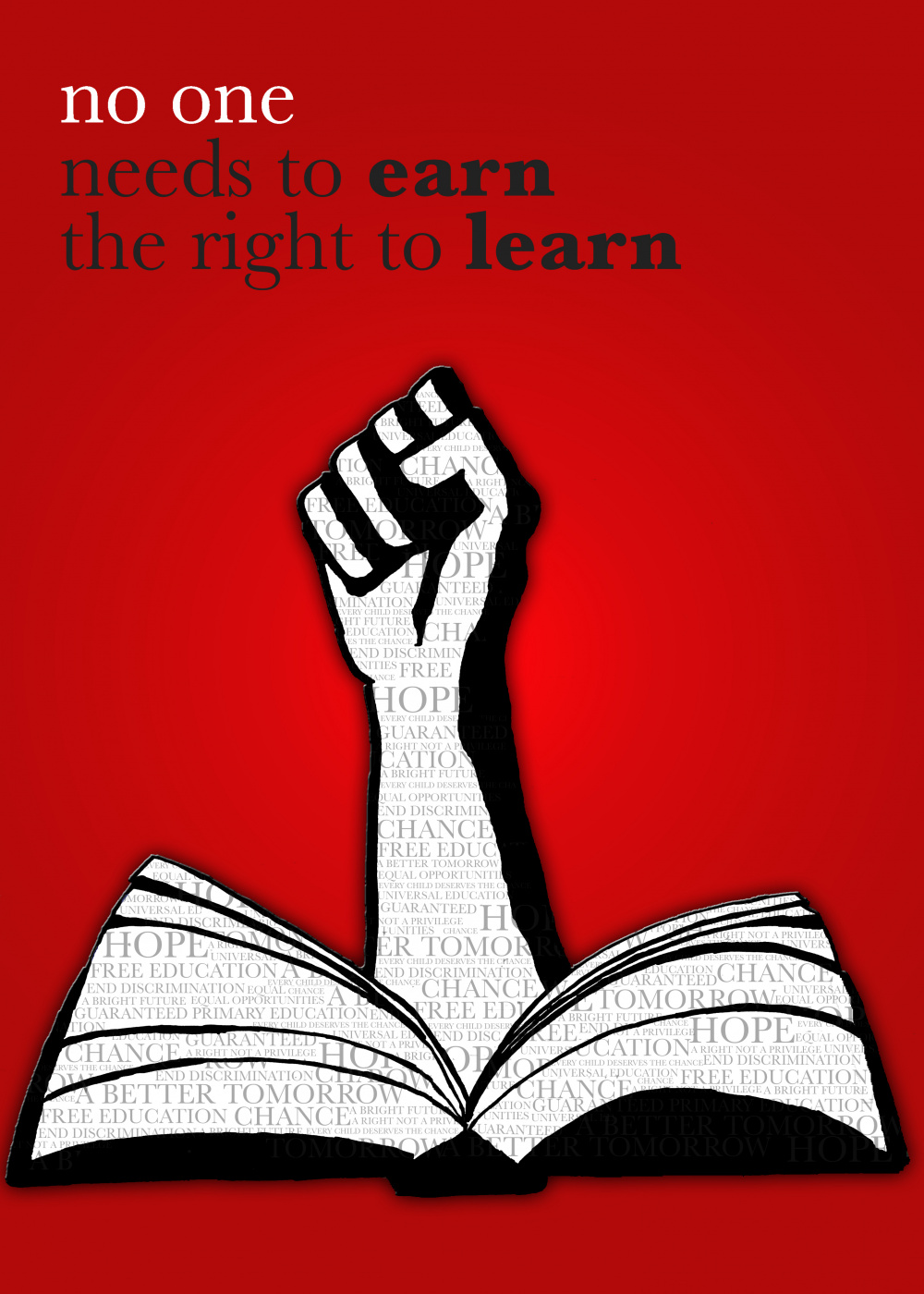 This poster symbolizes the right every child possesses to a free and compulsory primary education. The clenched fist as a popular and oft-used symbol of protest echoes the sentiments of all those who are deprived of this guaranteed right. It is emerging from the book to convey the power of learning and the liberation it provides one with.