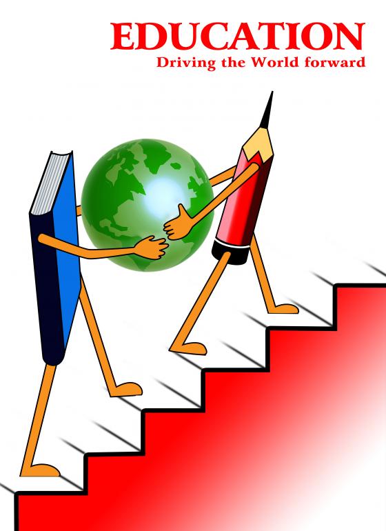 This poster is on how Education is leading the world in every area of development.It shows two cartoon figures(of book and a pencil representing Education) carrying the globe as they climb the stairs.It simply means that with Education the world can get to the next level or stage in development. The color green was used for the globe because the world is in the development stage,and it can only h