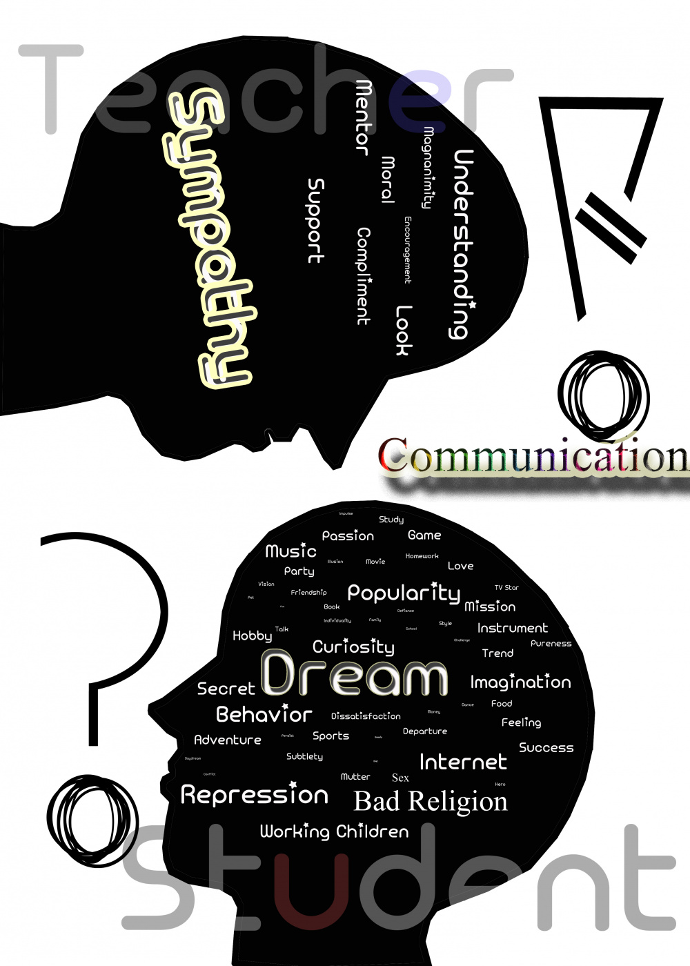 Between Man and Man, the Most Important Thing is Communication. Each Other´s Questions and Answer Each Other´s Thoughts Dragging Through the Conversation is Important. The poster is a Teacher Student Head to See a Lot of Think and Even the Teacher´s Head and Empathy, Encouragement and Understanding. Student Head the Myriad Thoughts and Yen, the Biggest Dream. Teachers Encourage E