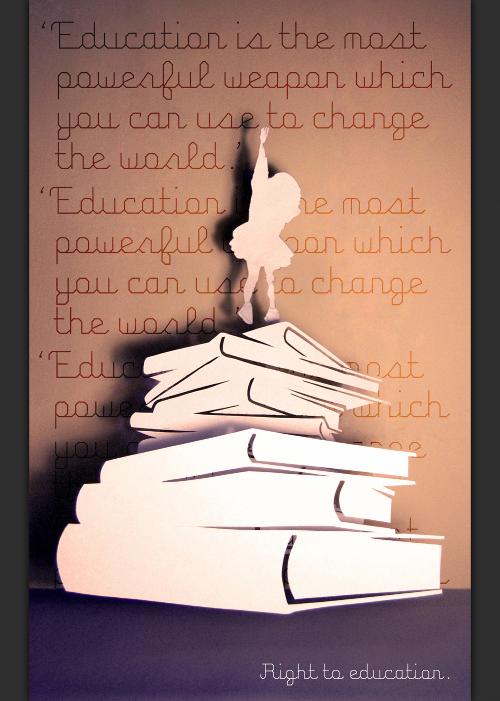 In response to the brief, I designed and created this poster to convey a child reaching and striving for knowledge. A privilege often taken for granted where I am from, Australia. The piece was created in its entirety from cut out paper, layered and lit in such a way to get across a certain mood. The typographic element was added later in computer software. Thankyou, Regards Marco Di Stefano
