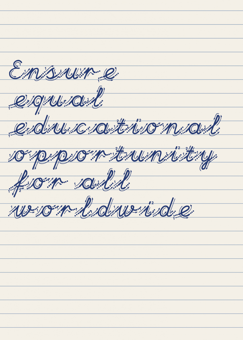Literacy is a powerfull tool to assure human freedom, as said by pedagogue Paulo Freire. By the hand caligraphy conmonly used to teach writing I wanted to express the idea that all countries must guarantee quality education accesible to all children in the world. Riches countries must re-learn this lesson and encourage and support developing countries.