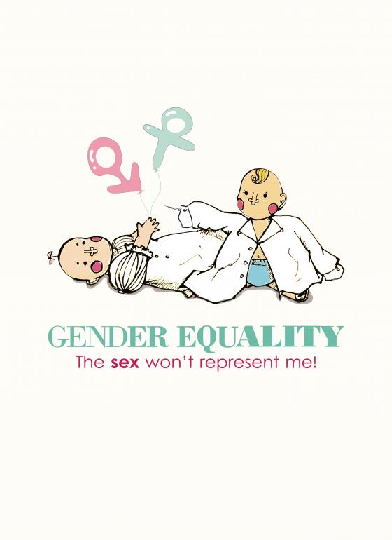 The thoughts of this poster is "I´m unique and irreplaceable.Don´t judge me by my gender. So,I use innocent babies as selfhood,and wear them with colorless clothes as equality. Besides, these baby use the pin to poke out the balloons that represents breaking the inequality.