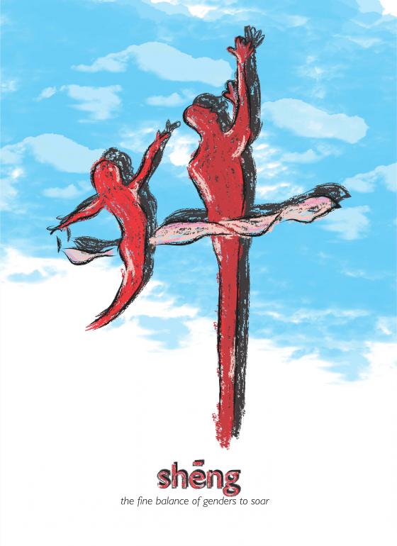 "Sheng" (å) is the chinese equivalent of "ascending, promotion and soaring". In this case, the red male and female silhouettes are fitted in line to make out the character, against a blue sky background. This underlies the symbolic meaning of how it is needful for both genders to be together to soar and rise ahead. Red is chosen as it is an auspicious colour, indicative of p
