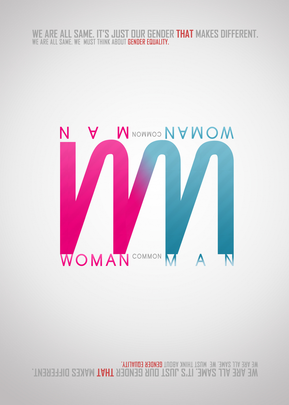 we should respect each others color & characteristics. when you look at th poster. W&M are naturally seen.´W´ painted in pink stands for woman. ´M´ painted in blue stands for man. and connect ´W´&´M´is part of Common. But look at the poster upside down, that´s opposite meaning. In this way, who someone like something(color,jop..) we must reapect them