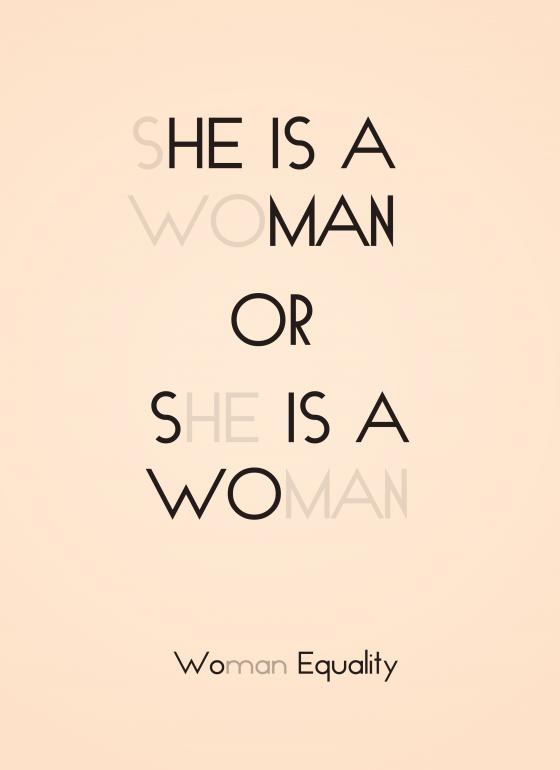 It is a fact that gender inequality seeps through many aspects of our culture. Looking at basic English words can bring this to mind. Using the simple sentence "She is a woman," the poster attempts to bring some equality to the feminine words by playing a typographic game. In order to spell the word she 66% of the letters can be used to make the masculine word he leaving just 33% of the
