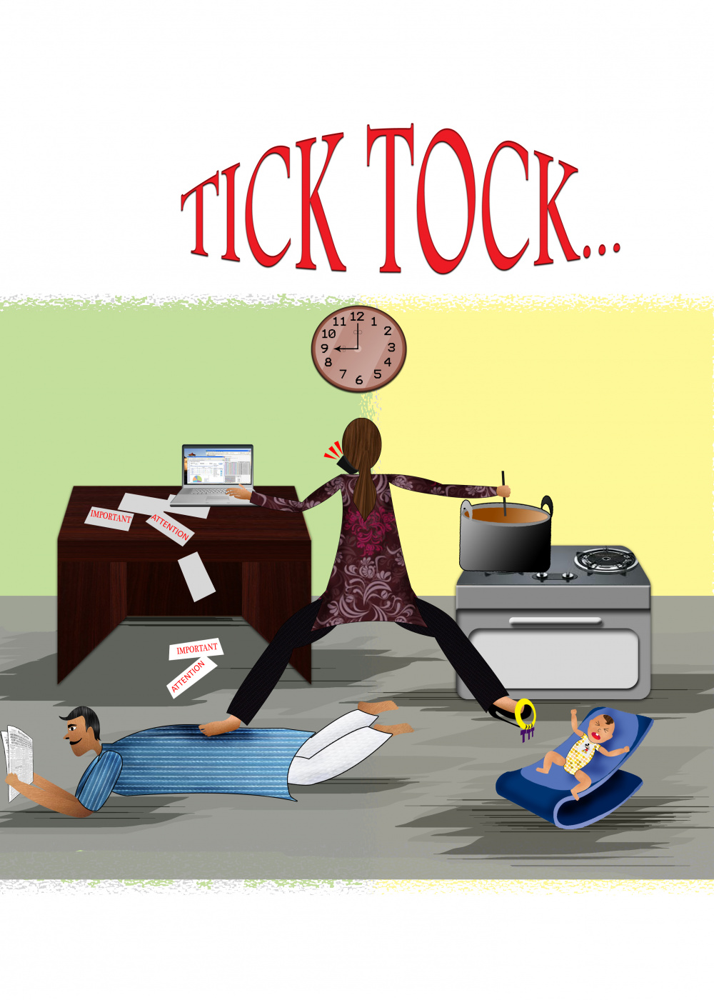 The poster depicts the talent of multitasking a women accomplishes even before the day has begun. A women has the ability to work professionally and maintain domesticity for her husband and child. The flip side is though that she is outstretched a lot more than she was before. At first her obligations were solely at home, but now as professional doors open for women in various occupations everywhe