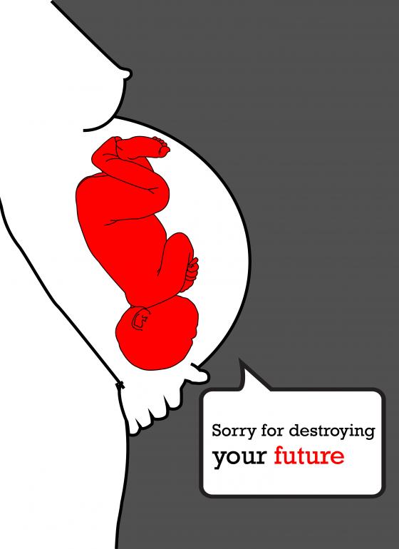 Women´s social participation is strongly influenced by childbirth. Women may leave, move or quick their job for the childbirth Even more, single mothers are treated unfairly and devote their self to infant caring. The submitted work illustrates the first moment of encounter mother with her baby (Generally, the first encounter is carried by pregnant tester). âSorry for destroying your futureâ