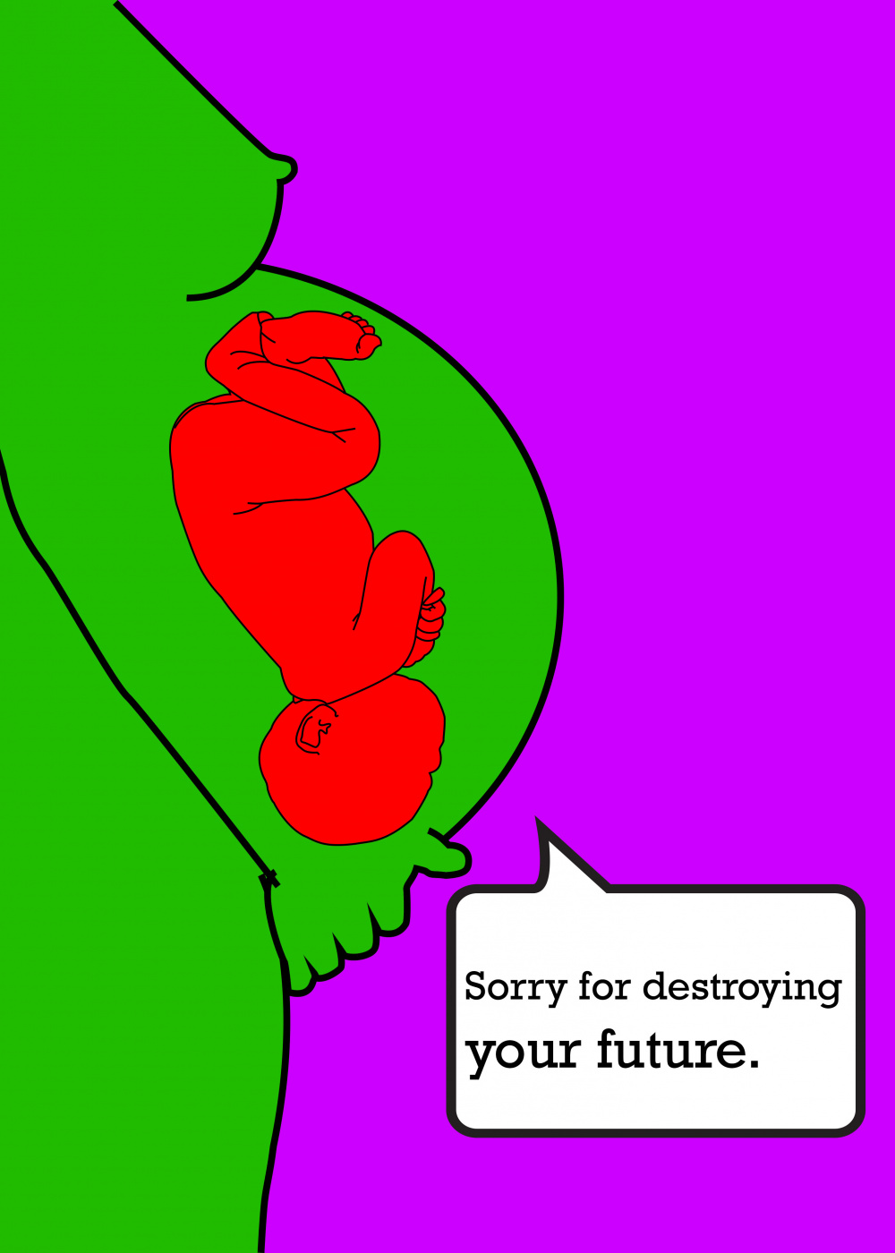 Women´s social participation is strongly influenced by childbirth. Women may leave, move or quick their job for the childbirth Even more, single mothers are treated unfairly and devote their self to infant caring. The submitted work illustrates the first moment of encounter mother with her baby (Generally, the first encounter is carried by pregnant tester). ”Sorry for destroying your futur