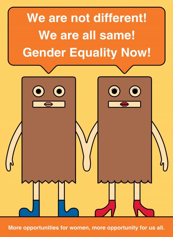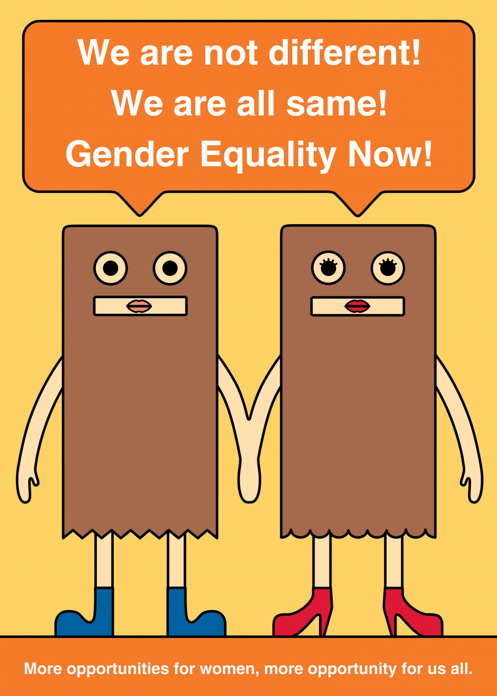 Men and women have two arms, two legs, two eyes, one lip. They all have the same physical conditions. I think that there is no reason for discrimination based on gender if the distinctive difference between men and women is taken out of consideration, and it seems to me that there is no need for differentiating between men and women. So, we are not different. That is the theme of my poster. The
