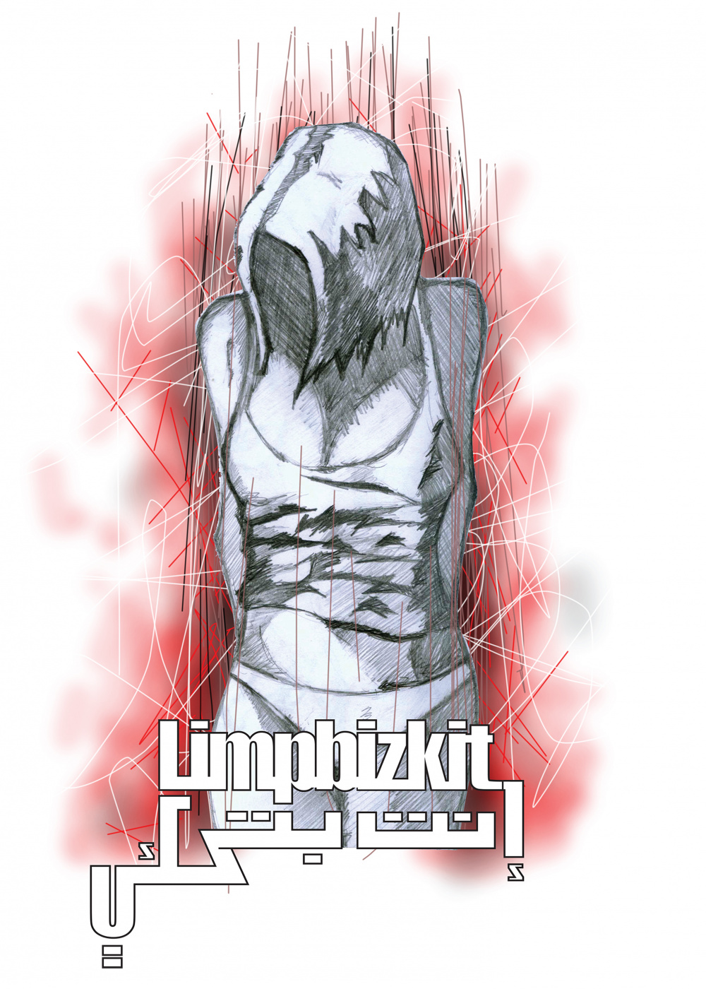 "limpbizkit" in arabic literally means "when i shut up". so the typography compiles to a sentence that states: "You talk when i shut up" and it can also go in reverse saying: when i shut up you talk". It represents the authority of the man and his dominance on women. Limpbizkit also makes reference to the band, whose style of rap-rock is aggressive and powerful i