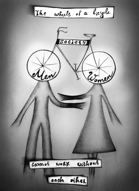 The bicycle is a simple but unique invention. It could be described as one of the most efficient human-powered means of transportation. In that sense itâs easy to imagine the society as a âbicycleâ that helps us moving forward. As every bicycle equally needs its two wheels, the two component parts of the society â the men and the women have equal importance for the progress of the society