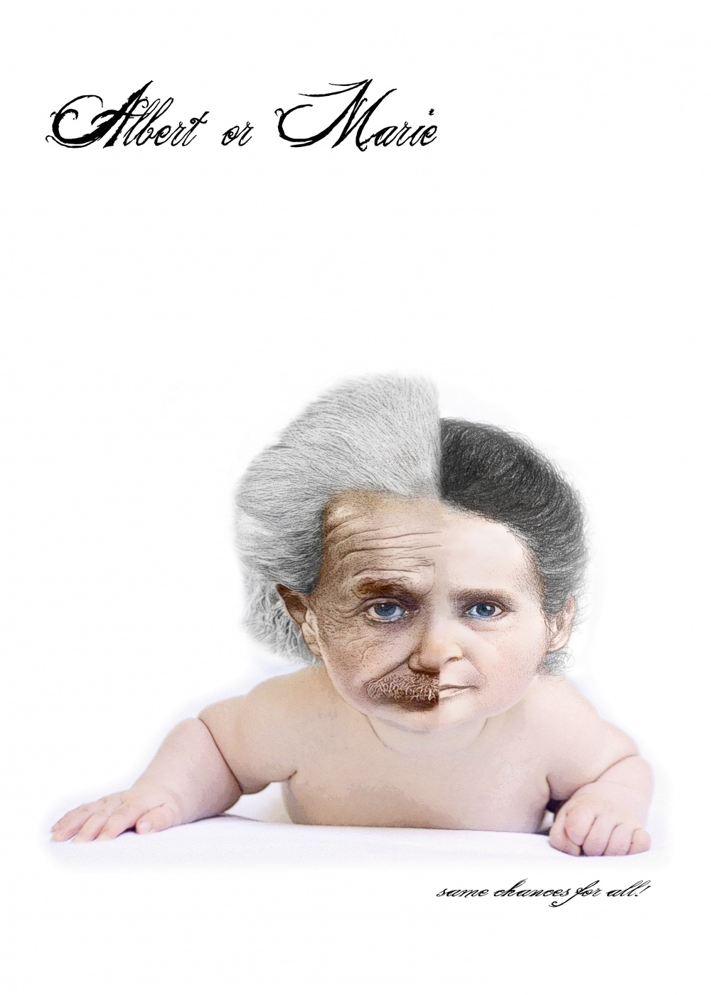 Albert Or Marie ? In every human being lays potential (to be exrta-ordinary). This potential should not be underpressed from the very beginnig of life on. In many places on earth a girl doesn´t count the same as a boy, even before she is born. The artwork i want to submit uses a baby as a symbol of potential. The viewer can not differentiate whether the child is a boy or a girl. The faces
