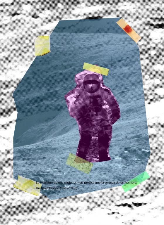 Las mujeres conquistarà n aquel espacio que en esta cruda realidad se les niega sin derecho a replica. El cartel representa una mujer que conquista aquel espacio. Tramite los iconicos colores de los dos sexos (hombre azul, mujer rosa) se ilustra una situacion (la llegada del "hombre" en la luna) que fue caracterizada en mi opinion de esta escena a sentido unico. Women will conquer this