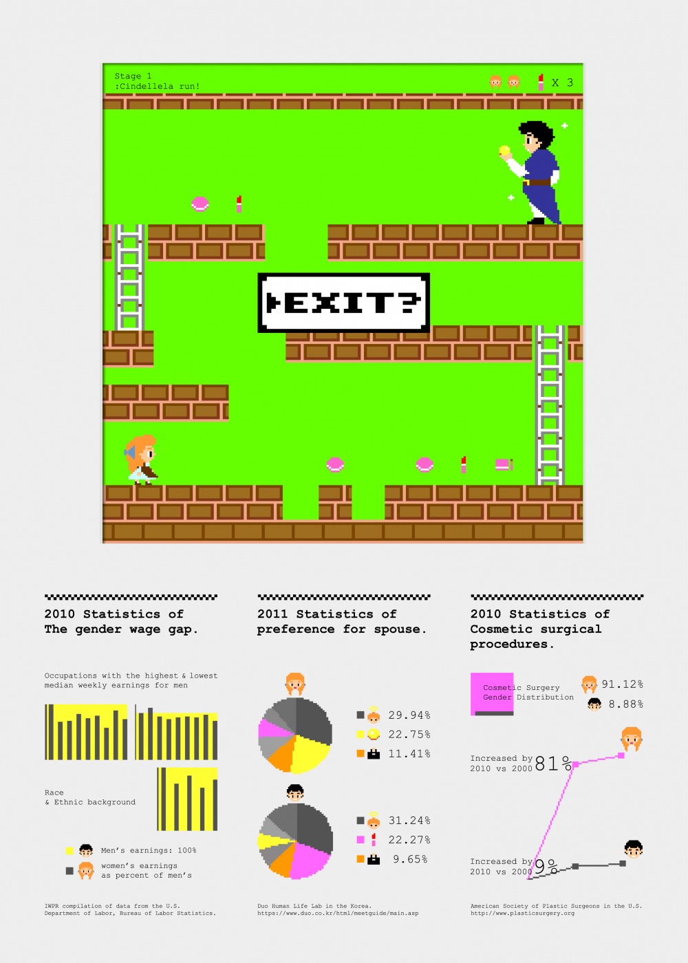 "EXIT?(1) & EXIT?(2)" are series./Poster shows "Woman take care of her appearance to meet a man."."EXIT?" is Suggest exit gender inequality./Below poster,there are information graphics. That shows,"The gender wage gap." is affect "Preference for spouse." and also it cannot be ignored that affect "Woman´s cosmetic surgical procedures."