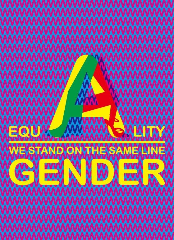 Redesign "Equality" in the letter "A" combination of male and female feet on the same line, and with blue, red "M", "W" letter diagram to reverse the totem as a background, the background color to blue, red color, and the same proportion. According to the above design concept, that is, directly points out the significance of the "Gender Equality".