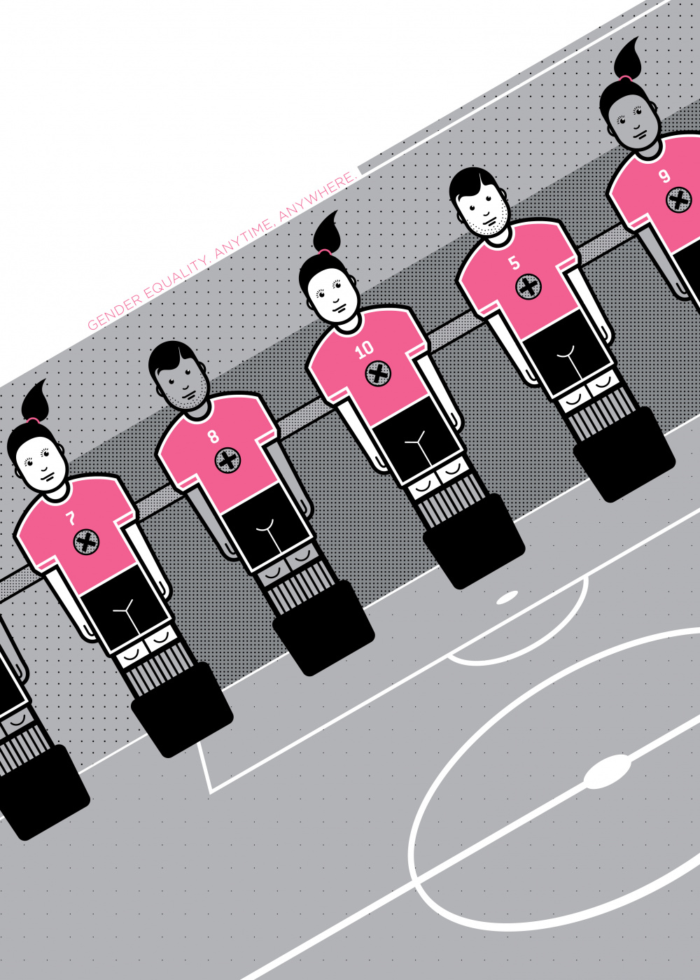 Foosball, a commonplace table game from the male universe has a stylized soccer player, always a male figure. Why this still happen today? A quick answer could be "It has always been like that" but we need to improve our perception and understanding with more core ethical values to change this, anytime, anywhere. Gender equality must be a reality in everyone´s life. A 3 color poster des