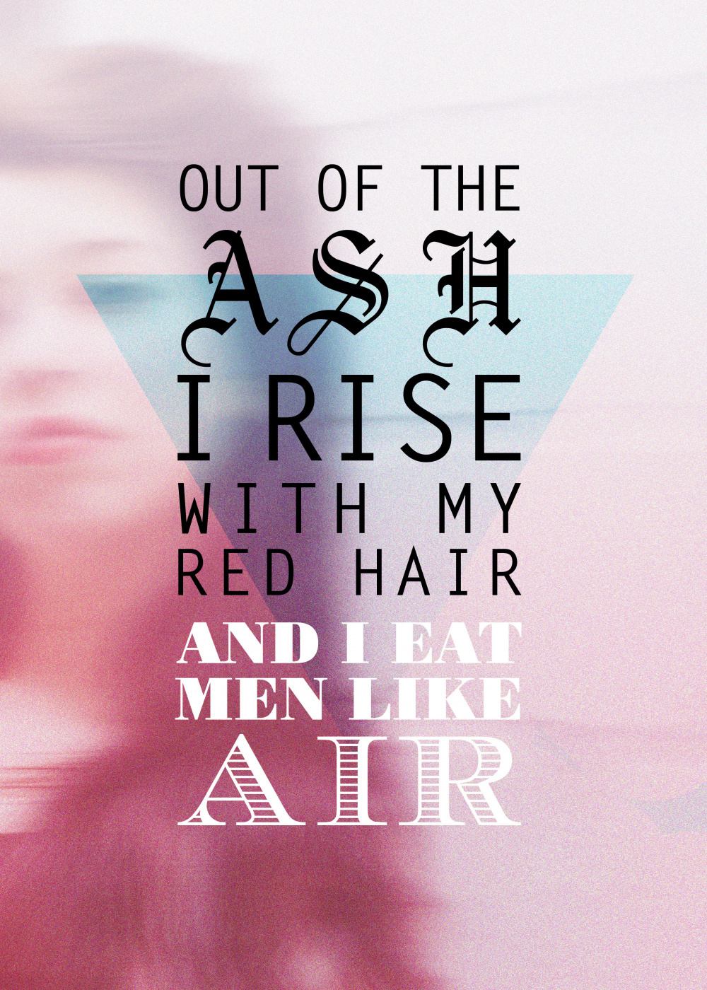 I used part of a poem by Sylvia Plath for this poster. She was an American poet in the 50´s and her lyric was modern and strong. She always had to struggle with the position of a woman that time, who had the duty to be a good wife / mother / housekeeper. A lot of her poems deals with these problems.