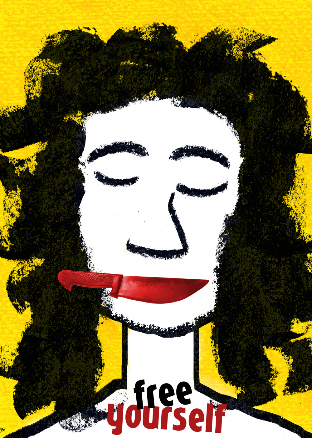 This poster depicts a woman who is in an attitude of submission, the knife that draws a smile, and eyes are closed, all this gives the gesture of acceptance of his condition.