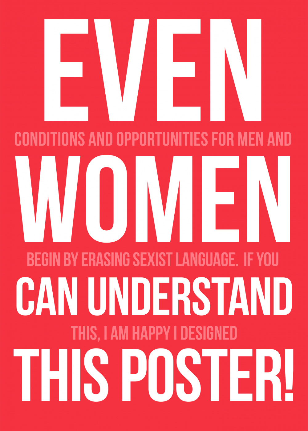 This poster was designed as a counter attack to sexist language in advertising. Equality begins in language: how we express about others; respect is the starting point.