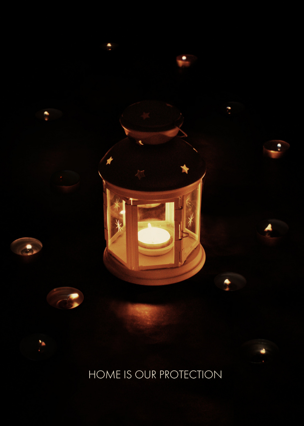 This poster shows a comparison between a candle and a homeless man. The lantern in the middle is the symbol of HOME. The small tea candles around the lantern will soon die out in the wind. Without the protection of the lantern a little candle light is in danger – just like a man without the protection of home. So the idea of the poster: a man without home is just as vulnerable as a candle in the wind.