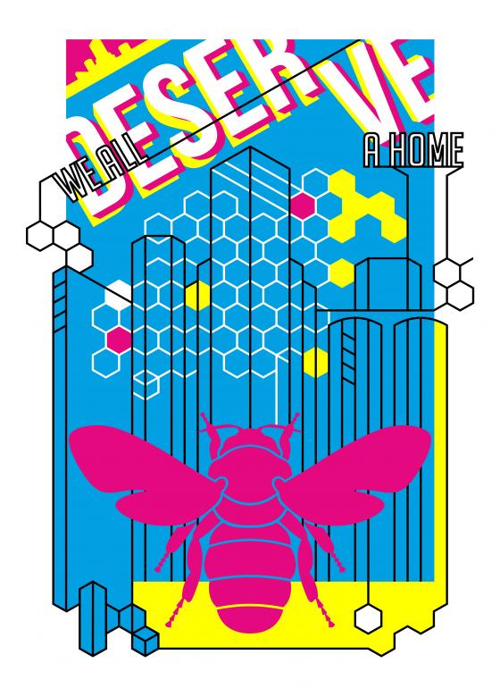 Re interpretación del cartel Metrópolis usando la figura de la abeja junto a su estructura social súper eficiente como metáfora aplicable para nuestros problemas de vivienda y desigualdad social.