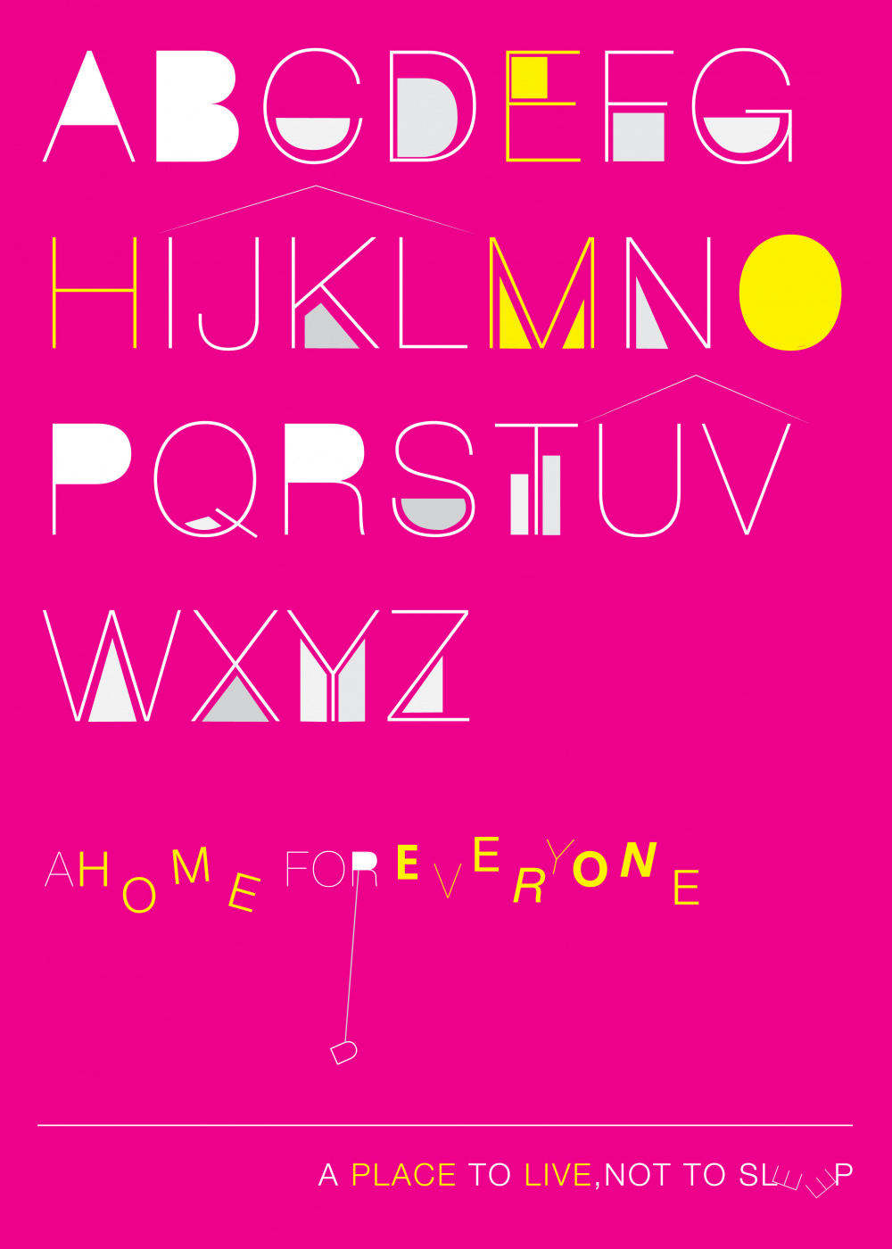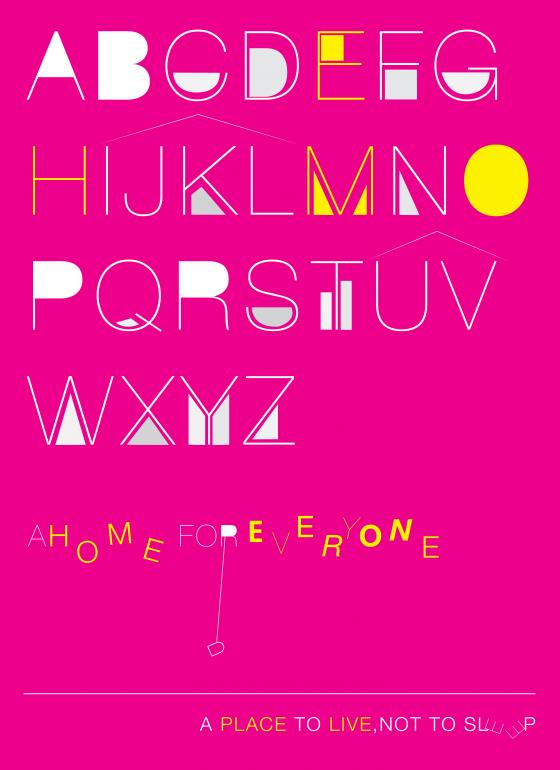 Everyone has a right to shelter. Thus i used typography to represent homes and under each letter I used shapes to represent the people in need...The different shapes show how this issue affects people of different cultures, races, etc. A home is a fun place to be thus i used typography which shows movement to represent the joy brought about by and in a home. The contrast in the graphic between the color & typography illustrates how if we work together we may brighten the future of both ourselves and those in need.
