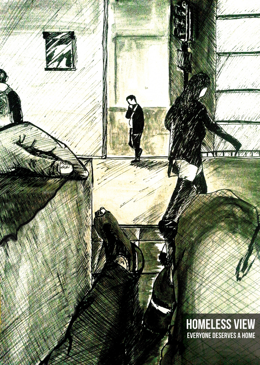 This image is what this homeless guy's eyes see. Imagine for a second that these eyes are yours, this is your body sitting on this sidewalk and people pass by you everyday. The feeling you are going to have deep down your heart is a fraction of that of a homeless everyday. In this poster the focus was on three individuals, education ( guy with a backpack) work(man in a suite on his phone) and shoping(girl in nice cloths holding a bag )