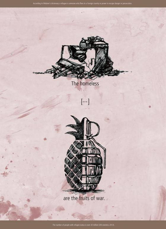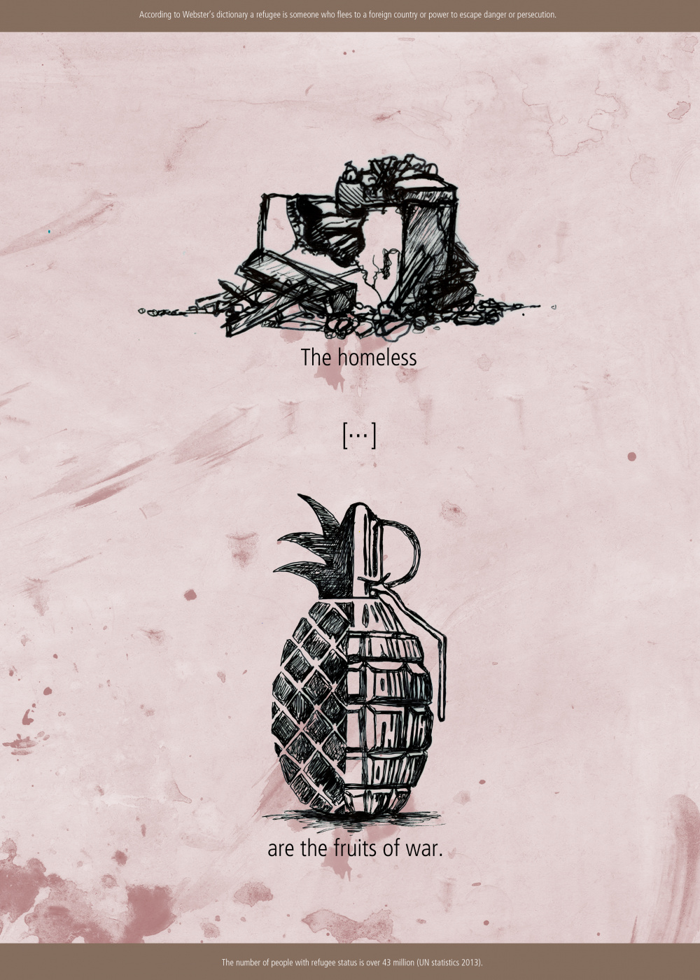 Home is more than wall or roof it is a place where you belong and connect to be yourself, you live their with dignity, with social acceptance soul and emotion, memories, social security. What we harvest and get from war is lose of sprits, lose of identity, lose of self, and lose of home, family and all the concept of homelessness. They use the metaphor the fruit of the war for something good like wining but I want to use it as a metaphor for losing houses. And I tried to make it has a simile like a bomb.