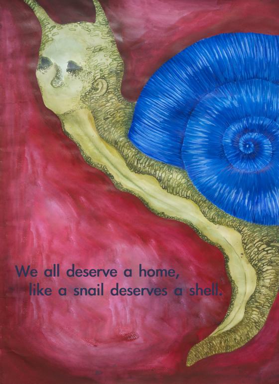 A snail with a human face represent that we all deserve a home once we were born, like a snail born with the shell.