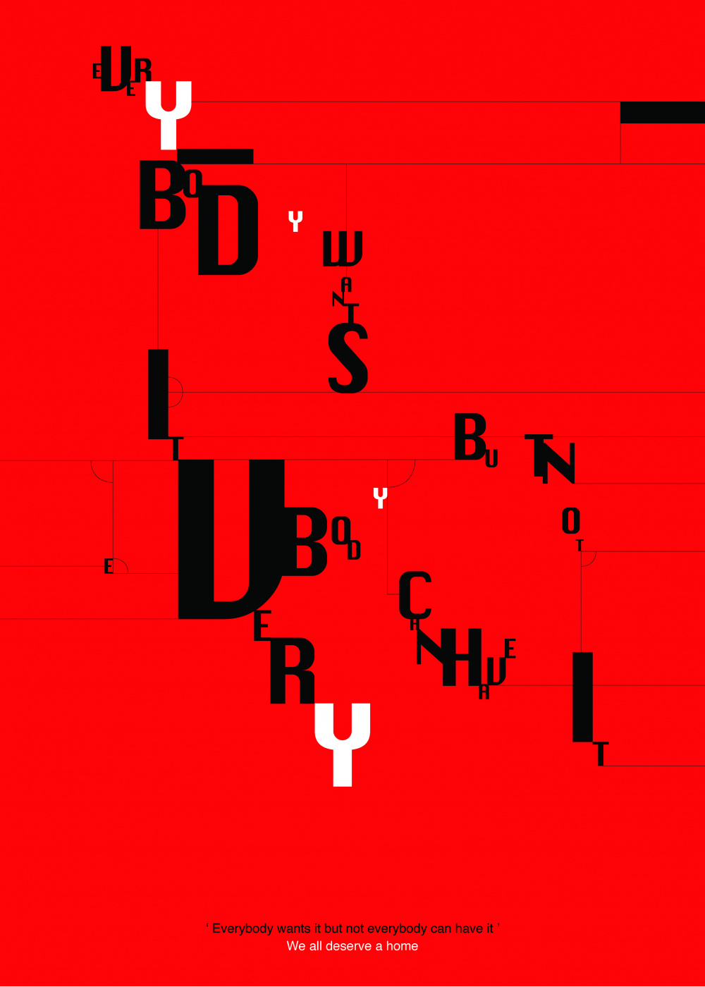 Everybody wants it but not everybody can have it, is a thought provoking statement that reflects the analogy that not everybody in the world can have the right to have a home. Using the medium of typography and thin weighted lines as a bases to this solution, openly visualizes the 'hanging' feel of the uncertainly that people will face in this global political issue. With questions of 'y y y' to the issue and the positive 'We all deserve a home' at the end that informs the viewers that people simply need a home to live in.