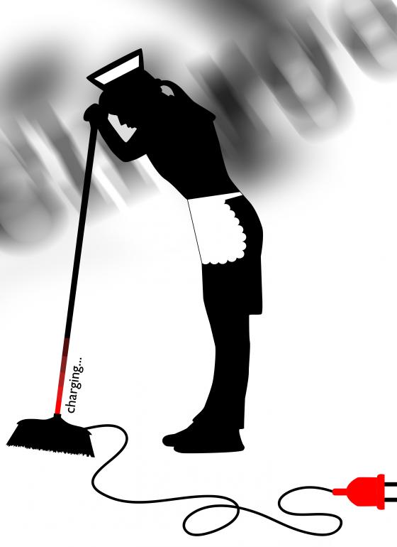 Maids work 24hrs, especially here in our country, they work all the time, doing everything in the house. So what I did is that i drew a tired maid in a vector and placed a charger on the broom stick. This shows that she is out of charge and should be charged to continue working...