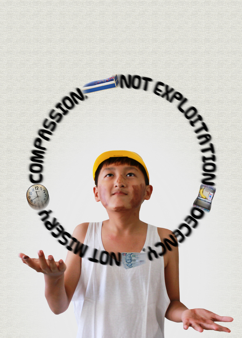 Poverty could make child labour necessary and sometimes, education is an unattainable goal for them. Hence, perhaps the best solution would be to make something good/decent out of their bad situation instead. The clock represents decent hours, the bed represents rest, the lunchbox represents nutrition as well as break and the money represents minimum wage.
