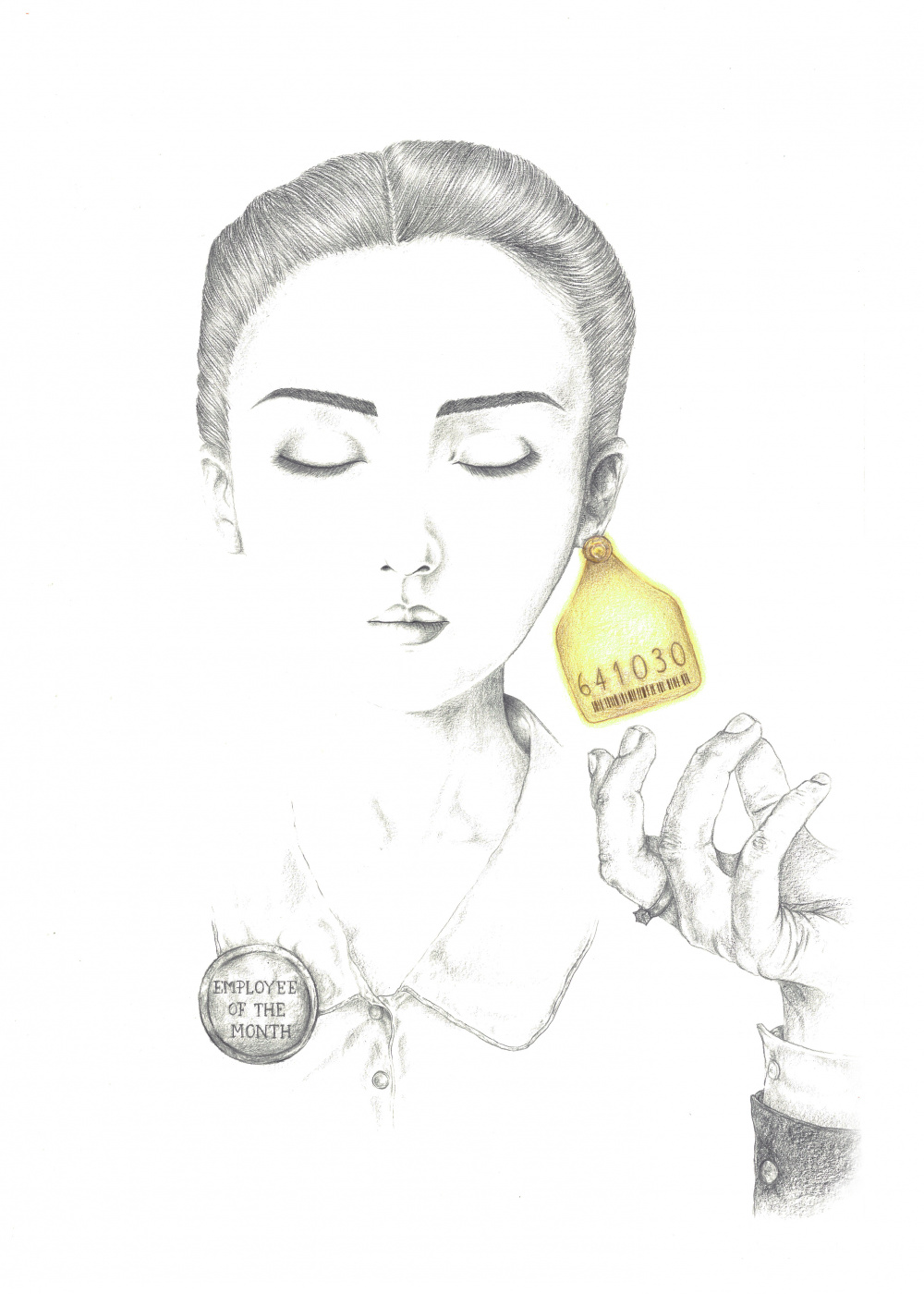 ( Artwork, Hand-drawn : Pencils and Color Pencils ) This beautiful lady stands for one of the people who were forced to be sold or traded ( human trafficking ). And the representation of the hand of the man shows his wealthiness with his diamond ring and the suit by working illegally which involves with Human Trafficking. The golden RFID tag represents the symbol of an animal that the man gives to this beautiful lady. In which if thinking about the thing that actually fits her is she should be wearing diamond earrings instead of this RFID tag. Therefore, in other words this means that the man who does his business by trading or selling people ,treats humans as if they are just animals. And the Badge which saying " Employee of the Month" represents that all the victims of human trafficking, they are actually working but by being sold and traded and with this drawing the reward the man gives to this lady ( the victims of human trafficking ) is as how he treats her as an animal ( RFID tag ). In other words all the victims of human trafficking get nothing from being sold or traded to work but an animal-like. By making the RFID tag the golden-like is another way of being sarcasm comparing the idea of she should be wearing beautiful jewelries or diamond which supports in creating an impact of being a beautiful lady but was treated like an animal. In choosing the beautiful looking lady as one of the victims of human trafficking for this poster is how it creates impact and the immense differences with a beautiful face and the RFID tag ( an animal symbolism ) on her ear.
