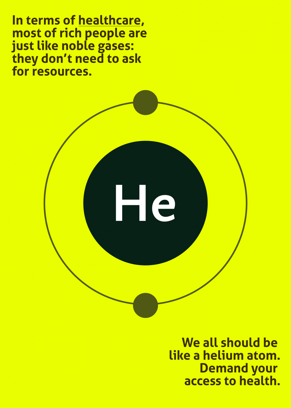 Noble gases, according to Chemistry, are atoms that can be considered "full" and that means they're complete. They don't need to ask for more electrons, because they already have the ones they need. I compared the helium atom to rich people, because having enough money and living in a non-Third-World country means possibility to afford to have access to health. Every human being should be like a noble gas atom: we shouldn’t ask for more resources, remedies nor medical treatment. These are rights we all should enjoy. I also used a color palette based on chemicals and sans serif typography to make it look contemporary and more suitable.