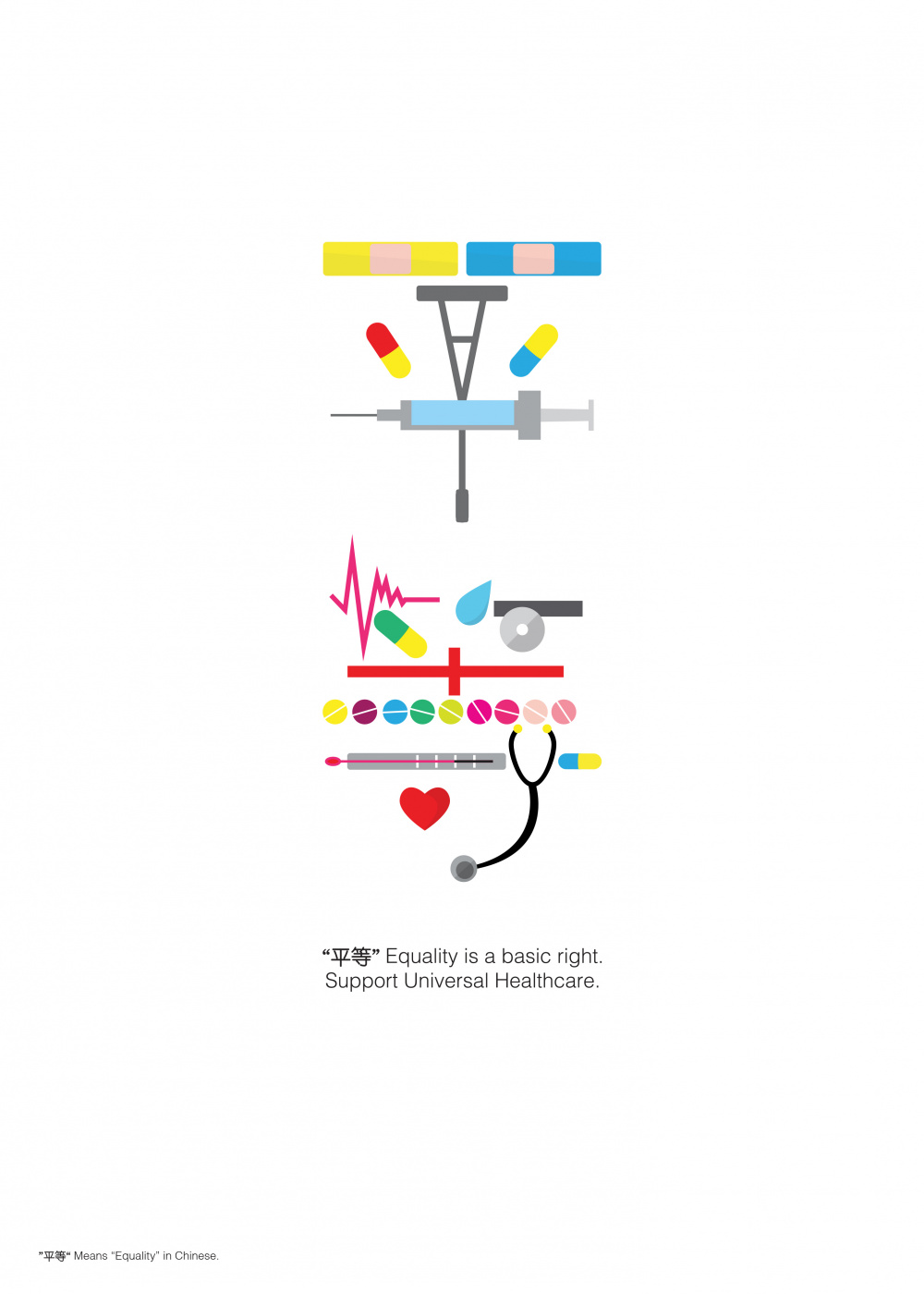 Universal Healthcare has been a very important issue. Each icon is related to healthcare. When put together, they compose “平等”, which means “Equality” in Chinese character. The idea is to deliver the concept of equality in healthcare to the Greater China audiences.