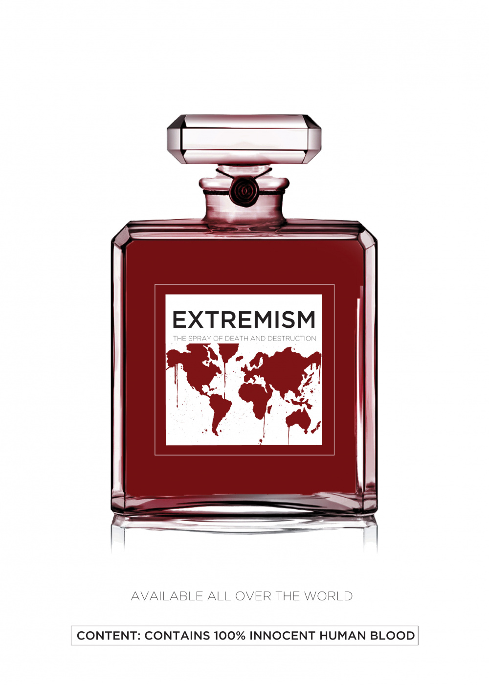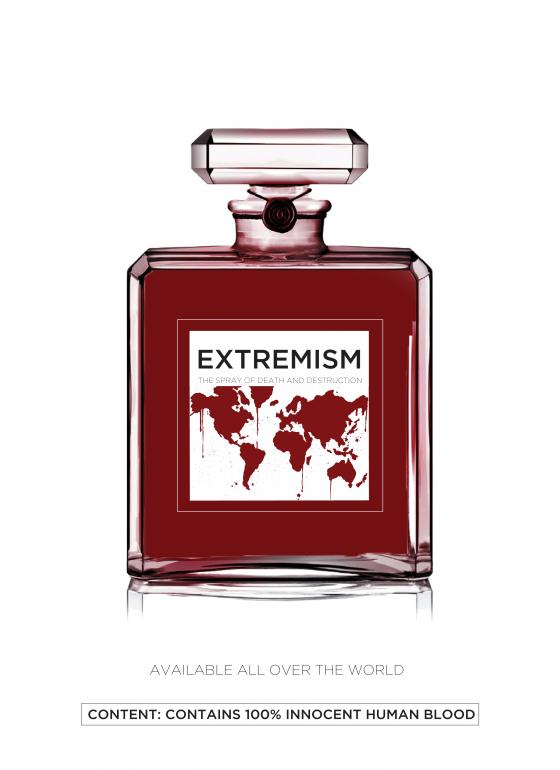 The poster is a direct description of extremism bottling blood in perfume bottle branding it extremism showing that extremists mingle in the society packaged so well that its hard to distinguish the evil from innocent. Just as the blood is put in the bottle of perfume . The entire world is dripping in blood due to extremism which has been placed on the bottle to depict its available all over the world and how extremism is spread all over the world.
