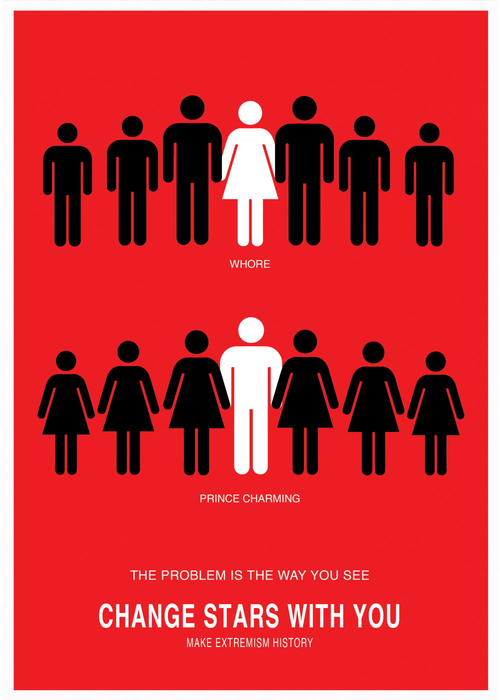 By this poster, I want to show the discrimination that exists between women and men on a clear and simple way. I wish to convey a positive message and a appeal for a change.