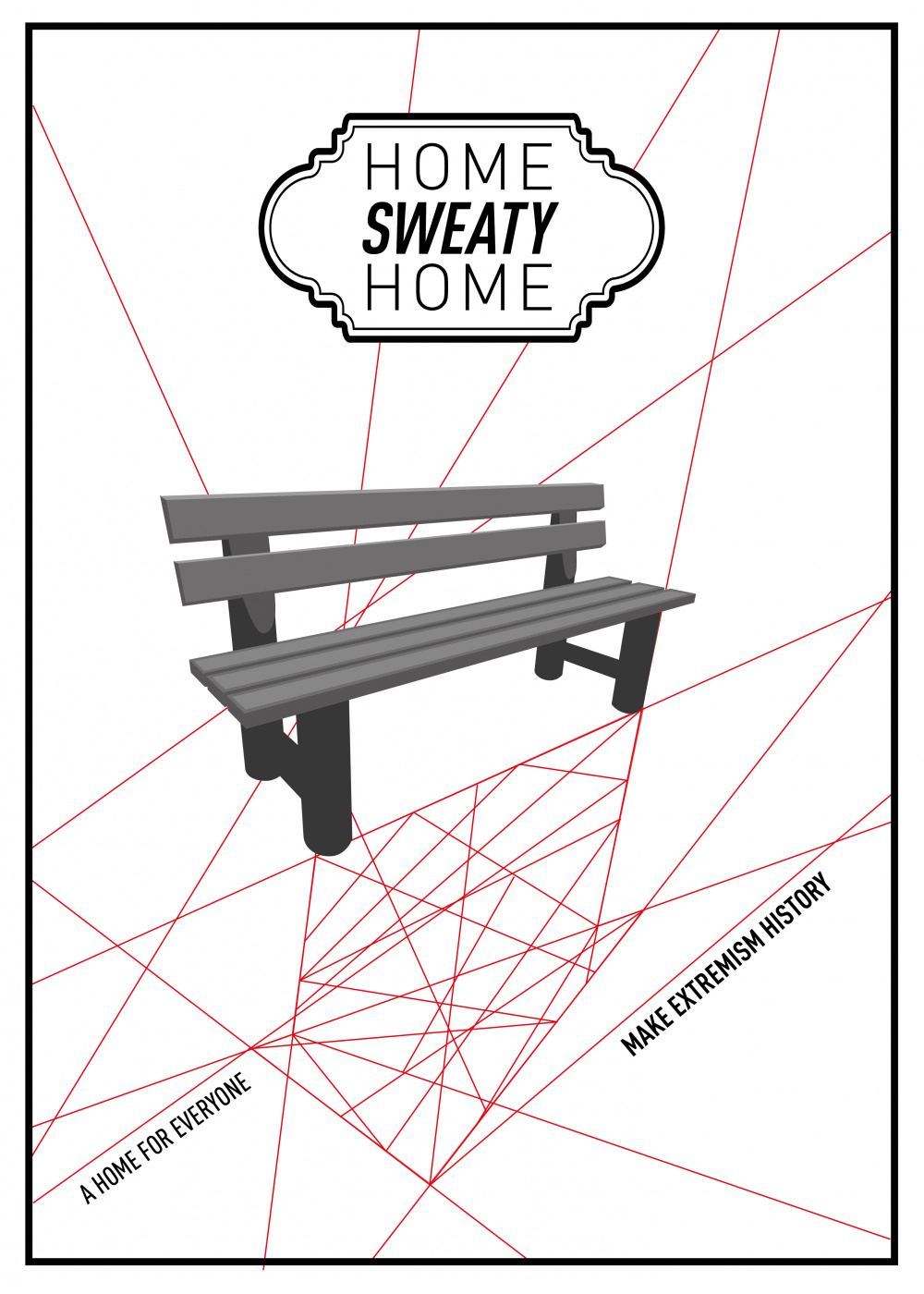 I present a poster that wants to portray the suffering and arduous life of a homeless, through the tangle of red wires, reinforcing the idea of difficulty in getting this achievement, color refers to the heart, blood, feelings, ..., that make a house where is their desire to live in, and through the bank that is often a place where they sleep.