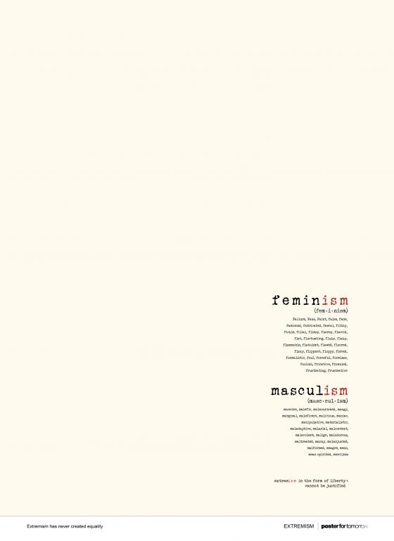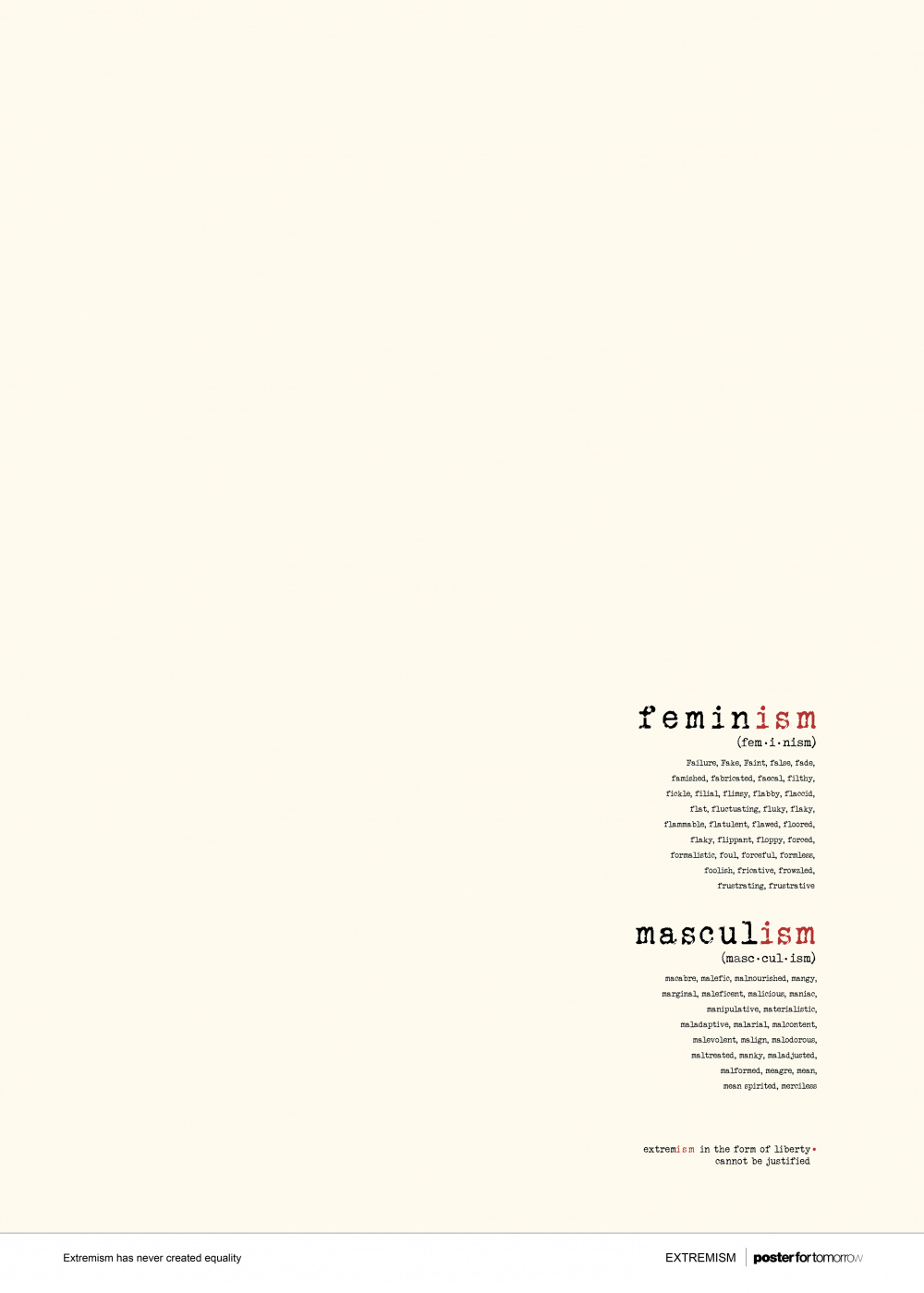 Extremism in the form of liberty cannot be justified. Gender Extremist groups are very vocal about voicing out their opinions. Feminism and Masculinism believe in fighting for the rights of their desired gender groups. They state to believe in implementing gender equality. Both gender extreme groups have good intentions, but have become very violent, and are known for ridiculing and putting down the opposite gender. This means that neither gender group are fighting for the rights of gender equality, but are fighting for the rights of their desired gender. This means that there is no equality. Both extremist groups cannot justify their actions in the form of liberty. Due to the fact that both extremist groups are fighting for their own liberty. Meaning that another group of people will not be liberated. This poster communicates exactly that. The poster communicates the harsh realities of both extremist gender groups. The poster does not promote either gender group. The message is communicated in the form of a typographic poster. You will notice that the words used under both gender extremist groups are harsh. This enforces the message behind the effect that the extremist gender groups have on society. The poster is very clean and simple, and utilises a lot of white space. The colour red has been used to emphasise on the similarities of both gender extremist groups. The colour red emphasises on the fact that both gender groups have the same negative effect that it may have on society.