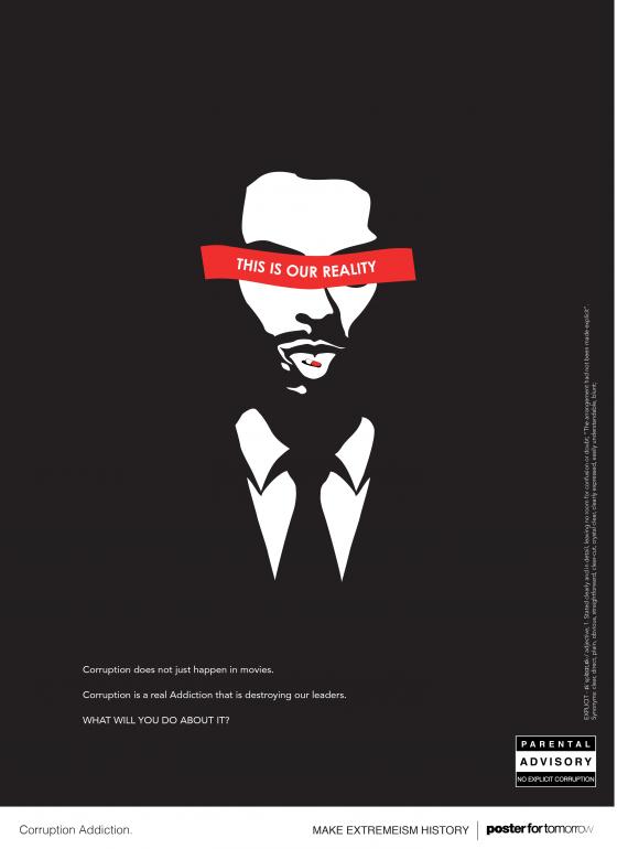 The concept for this poster is Corruption Addiction. Corruption is an addiction because once someone starts it is almost impossible for them to stop and it is an Extreme happening all over the world. Due to the fact that visual media / the film industry has such influence in today’s society, I decided that the best way to convey this message was to make the poster to look like a minimal movie poster. This was emphasised by the copy on the bottom left and the ‘explicit content’ on the bottom right. The man’s eyes are covered to represent how people keep themselves anonymous and in the dark, trying to keep their corruption hidden from the world. The ‘Parents Advisory No Explicit Corruption’ was included to emphasis both the movie poster theme and the concept of corruption. There is a definition of the word Explicit running up the right hand side of the poster for people to read, re-enforcing the statement that there is ‘no explicit corruption’ anywhere unless it is discovered. Which leads to the question at the bottom of the poster, asking the viewers what they will do about corruption. This provokes people to think about how to prevent or ‘cure’ our leaders from becoming corrupt.