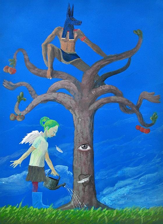 Revering the purity as a potencial that all beeings have. What we plant will grow. Anubis over the tree will weight our heart, as the feather that will land on the earth as our flight of life ends this journey. That our acts are pure, that your life can bee free from poison and elevated.