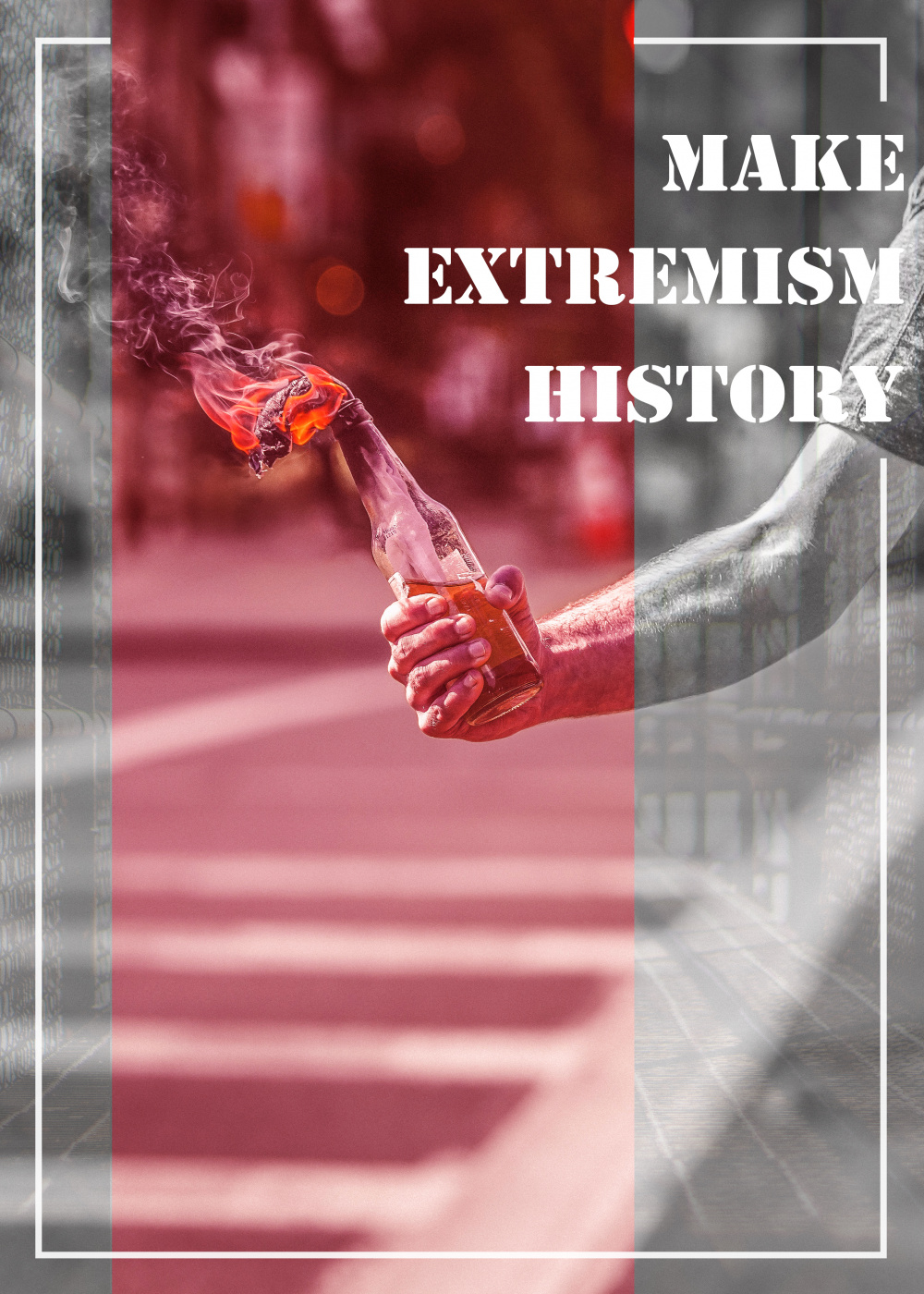 I have chosen a violent image which shows someone who is about to throw a molotov bomb. A violent and closely related to extremism scene. I have highlighted the violent focal point with a rend rectangular shape in red which stands for the blood caused by extreme violence. Additionally, I chose to make the rest of the image in black and white, highlighting the historicity and the old aspect of history. something which remains as memory and has lost all its color, something that fades.