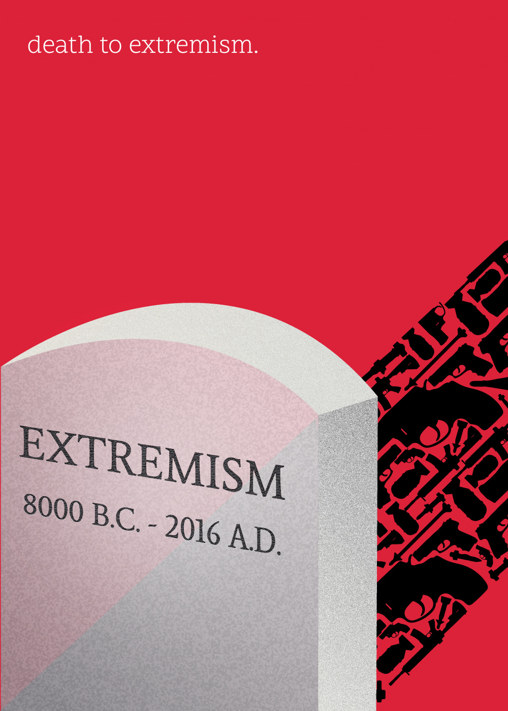 The tombstone is representative of the death of extremism. The guns and nukes build the shadow of the tombstone as if to show warfare being in the shadow of extremism