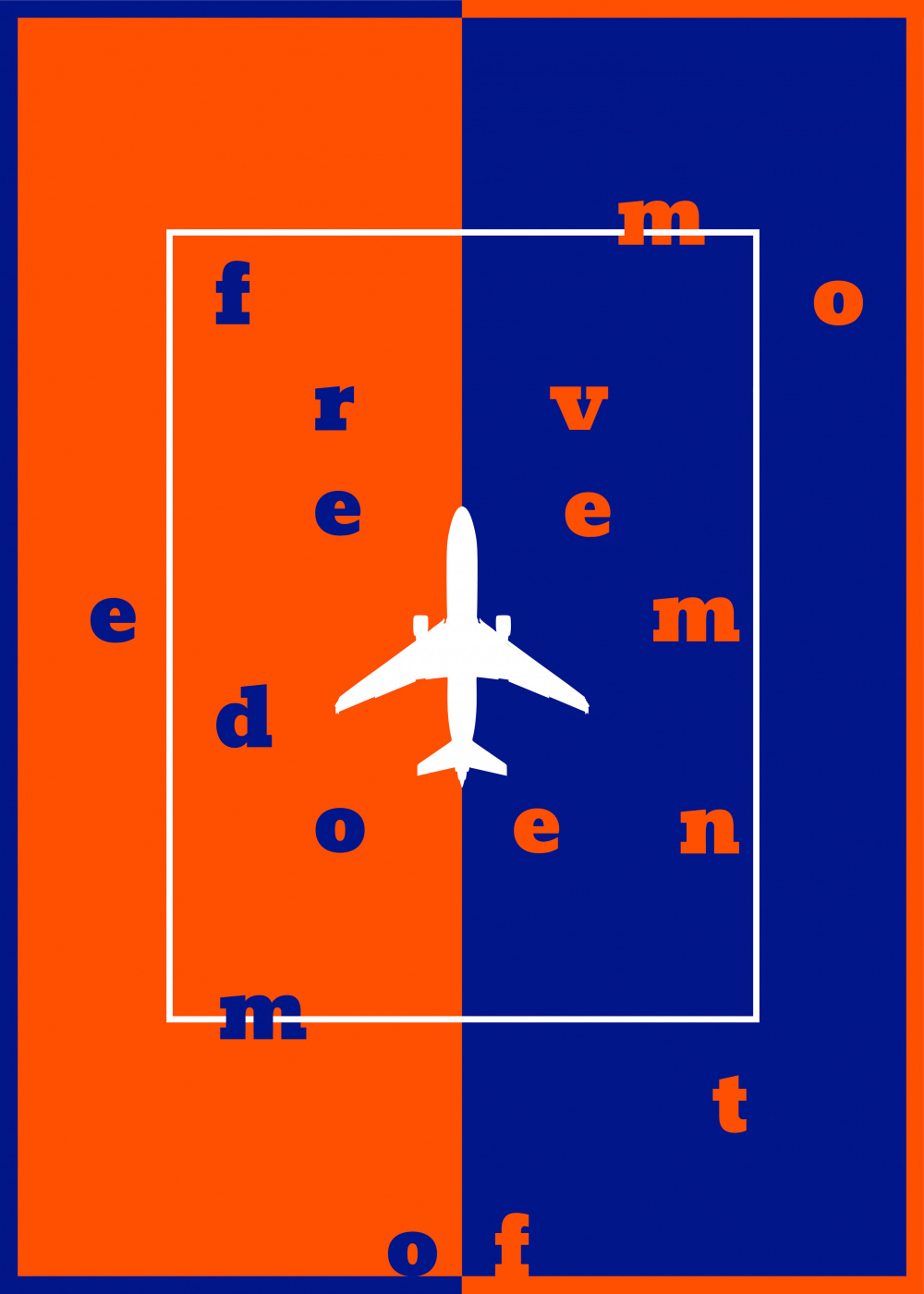This poster reflects that there are no borders, the only borders are in our minds. Those two opposite colours represent either the opportunities or lack of the them. The fact that the message ("Freedom of Movement") is broken in pieces represents that in some way, we are actually free, and we belong to nowhere and everywhere.