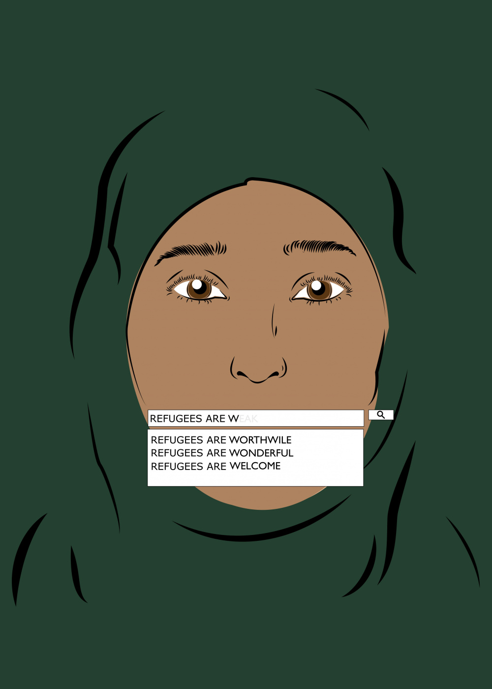 In order to make this poster, I decided to recreate the initial Google page, referring to the moment we do a search of refugees. Contrary to the idea that refugees represent a weakness, several other options are presented showing great values that can also be associated to refugies. In the background an illustration of the Muslim was used a green burqa symbolising this color both the color of hope and the color of the soldiers at war. The search box is positioned over her mouth giving her “voice” to defend herself.