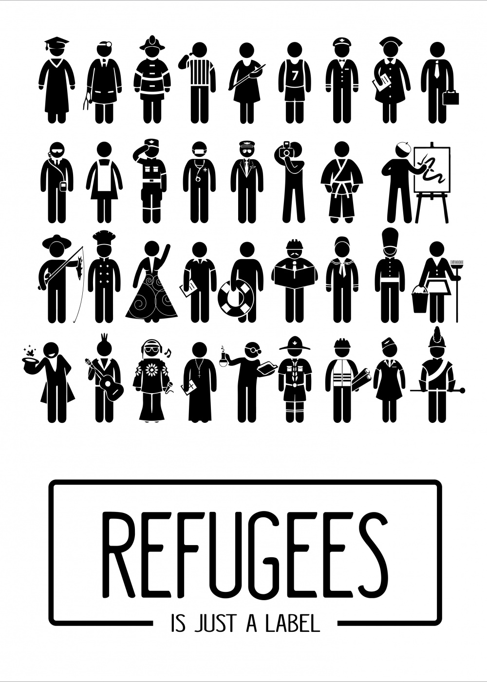 The poster intends to show that the refugees are much more than that. They are people like us, who had instruction and sometimes great jobs before the tragedies that made them flee from their countries. Therefore, they can even contribute for the economic development.